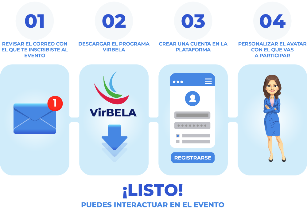 La plataforma inmersiva que se va a utilizar para el evento es VirBELA. Esta plataforma estará disponible únicamente para las personas que se registraron en el evento y para acceder a la misma deben realizar lo siguiente: